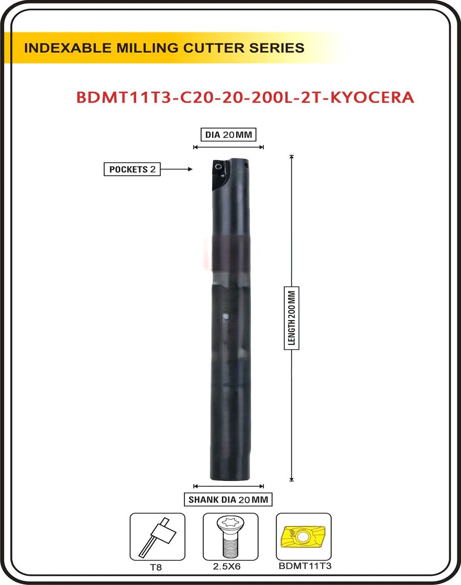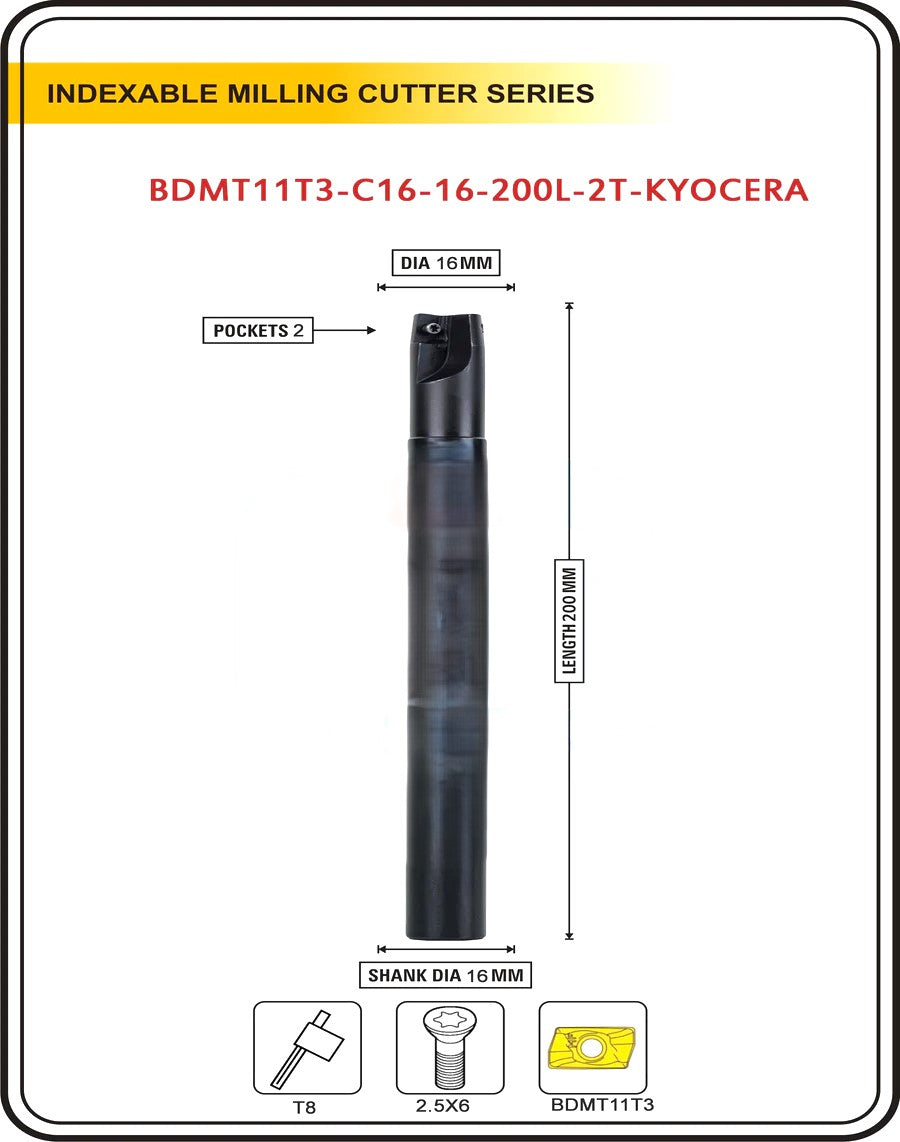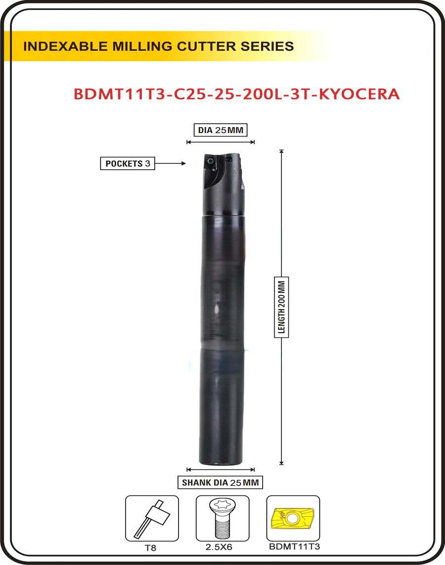 This is a precision-engineered Shoulder and Face Milling Cutter used in both CNC and Manual Milling Machines. Compatible with ISO BDMT11T3 carbide inserts, it ensures cost-effective and efficient machining compared to traditional HSS tools. The cutter body is hardened to 45–50 HRC, offering excellent wear resistance and long tool life.