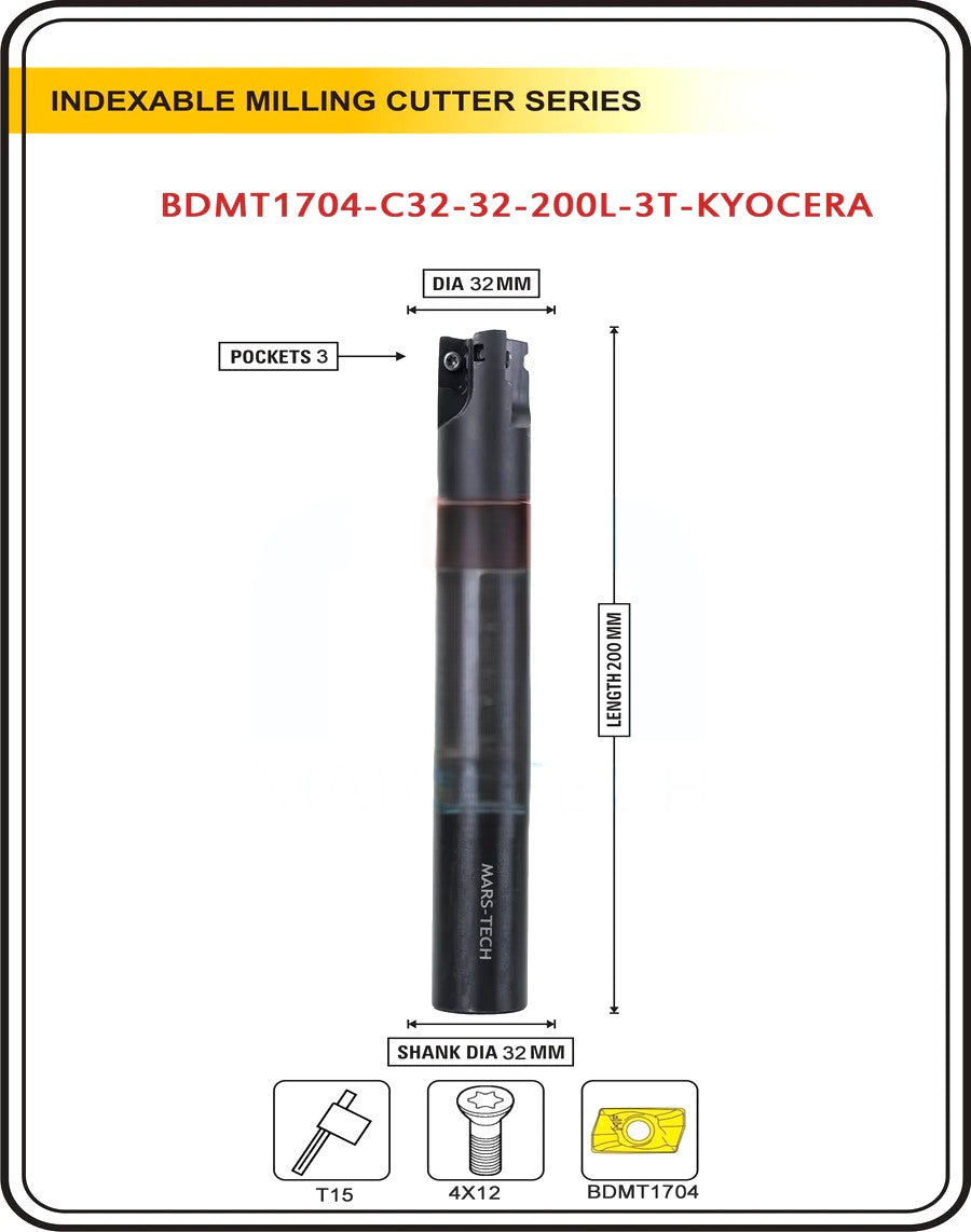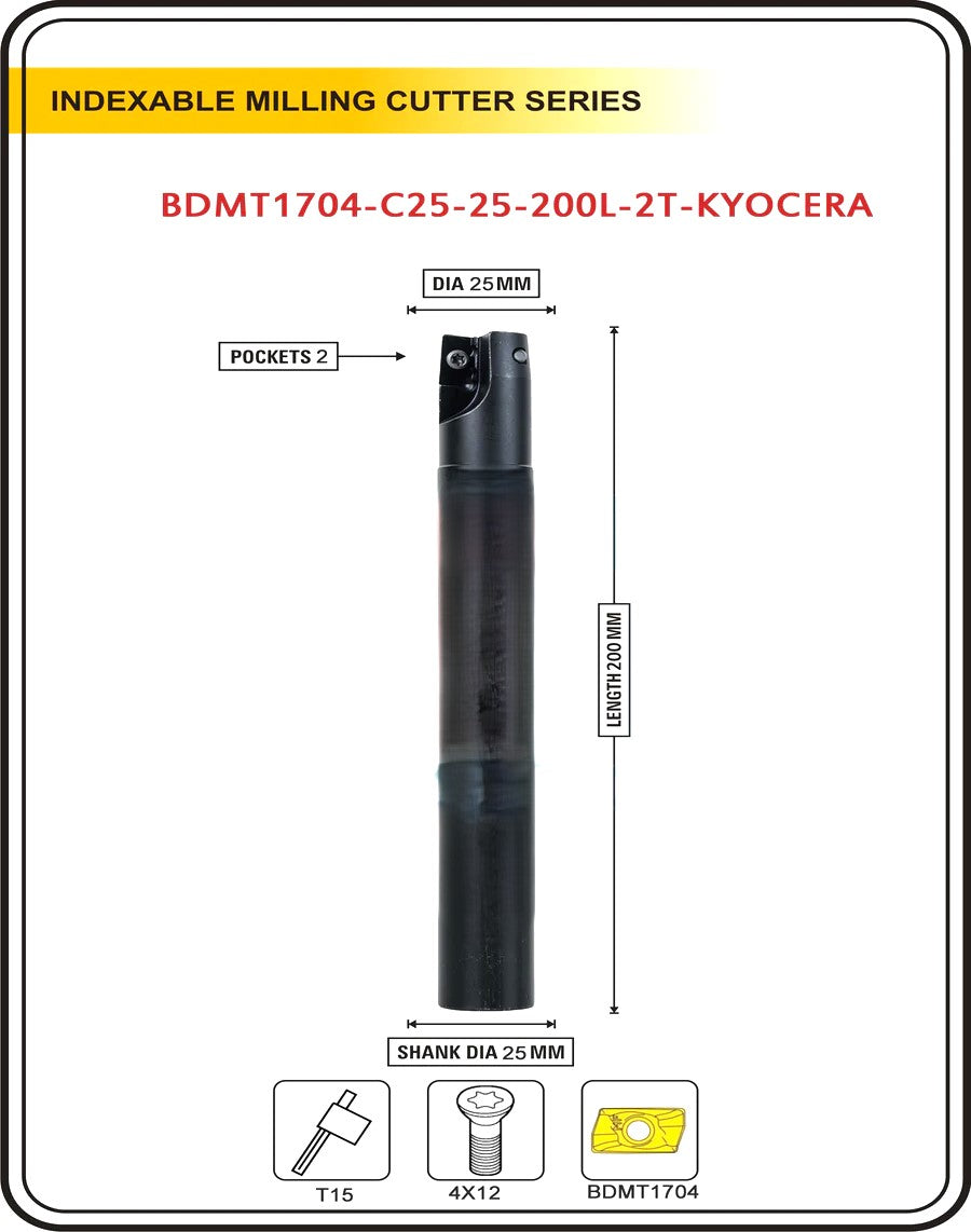 This is a precision-engineered Shoulder and Face Milling Cutter used in both CNC and Manual Milling Machines. Compatible with ISO BDMT1704 carbide inserts, it ensures cost-effective and efficient machining compared to traditional HSS tools. The cutter body is hardened to 45–50 HRC, offering excellent wear resistance and long tool life.