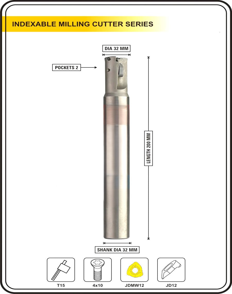 This is a precision-engineered Shoulder and Face Milling Cutter used in both CNC and Manual Milling Machines. Compatible with ISO JDMW12 carbide inserts, it ensures cost-effective and efficient machining compared to traditional HSS tools. The cutter body is hardened to 45โ50 HRC, offering excellent wear resistance and long tool life.